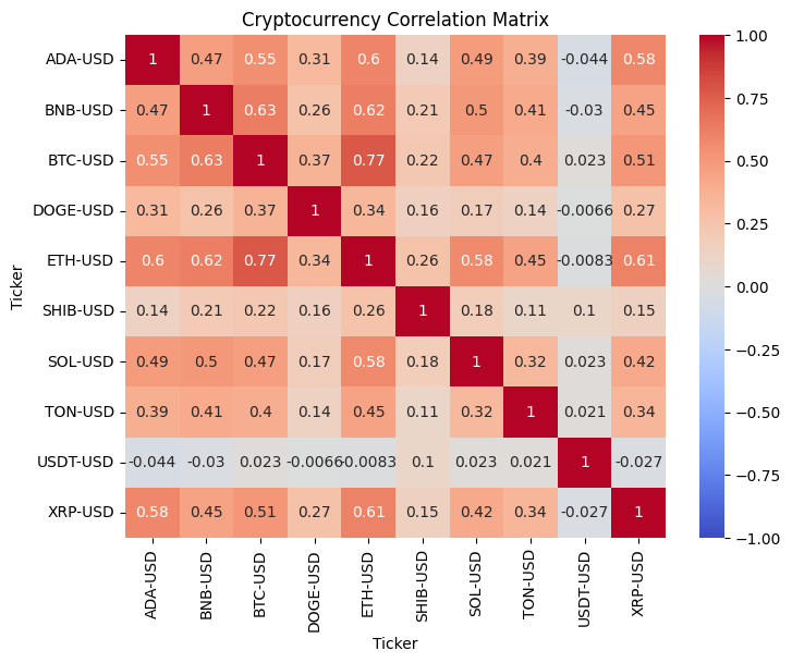 The correlation matrix identifies strong interdependencies between leading cryptocurrencies. Ethereum (ETH-USD) and Bitcoin (BTC-USD), for instance, have a high positive correlation (0.86), indicating that price changes in these assets tend to move in similar directions. Stablecoins such as Tether (USDT-USD) have little correlation with other cryptocurrencies, further establishing their position as relatively stable assets. The matrix offers insights into market behavior, assisting investors and analysts with risk management for diversified cryptocurrency portfolios.