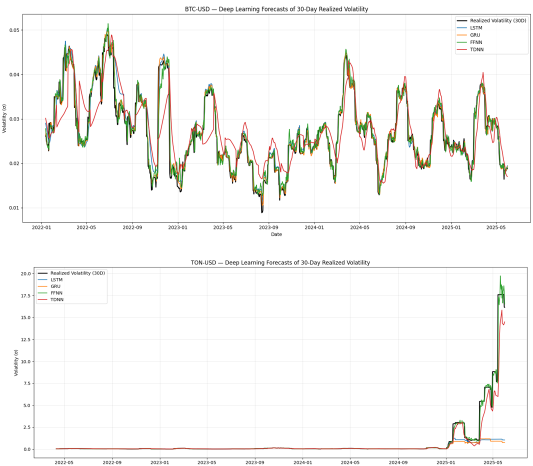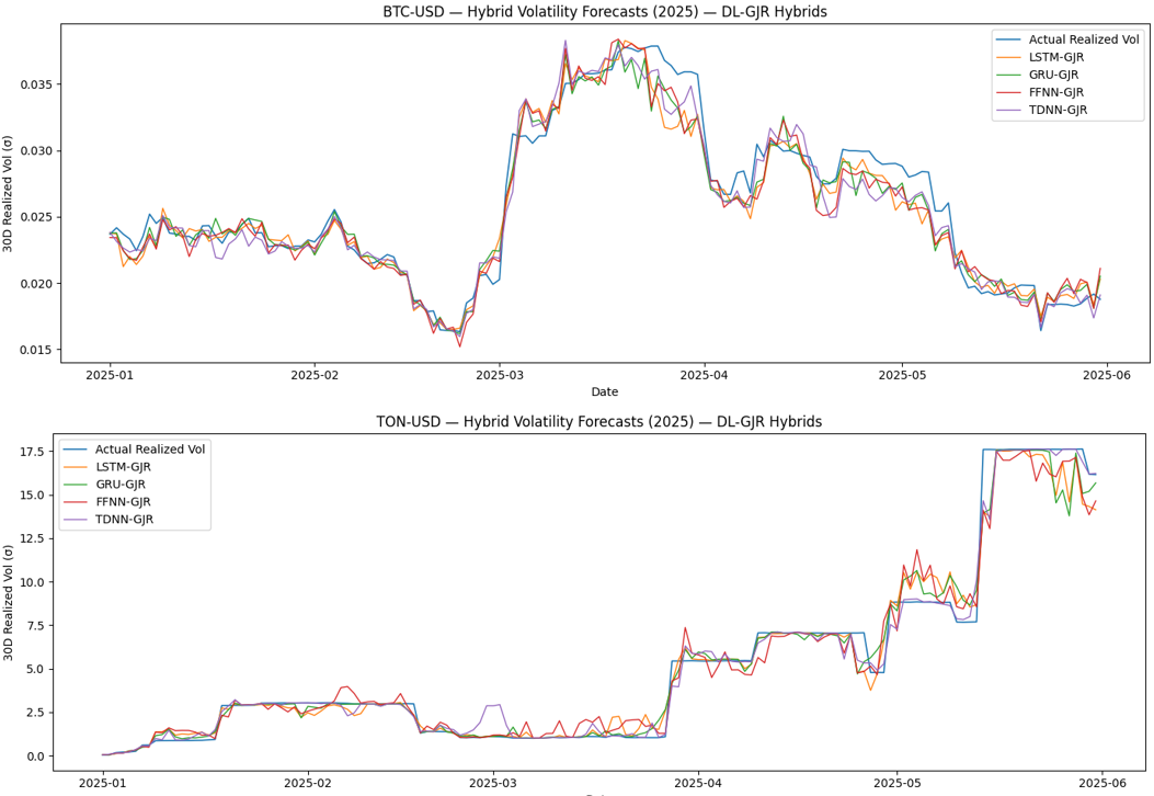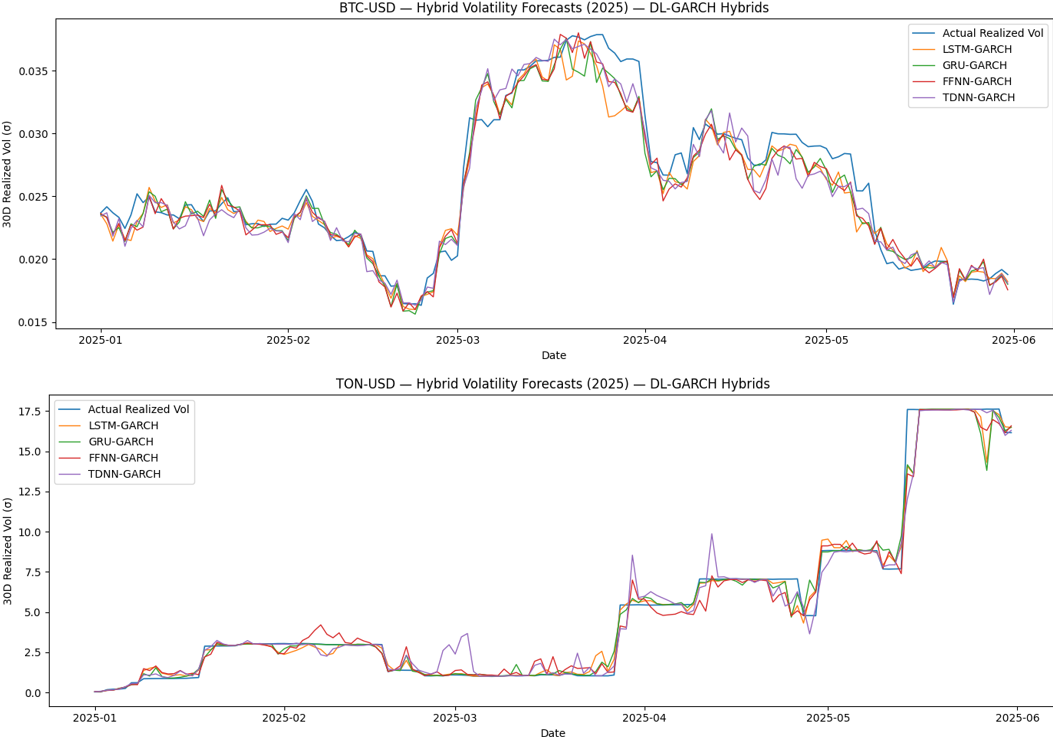 Figure 4, Actual vs. predicted volatility for the BTC-USD and TON-USD. Hybrids better capture the persistence in regimes and shocks. Generally, hybrid GARCH-DL frameworks provide the most robust volatility forecasts across conditions of the crypto market.
