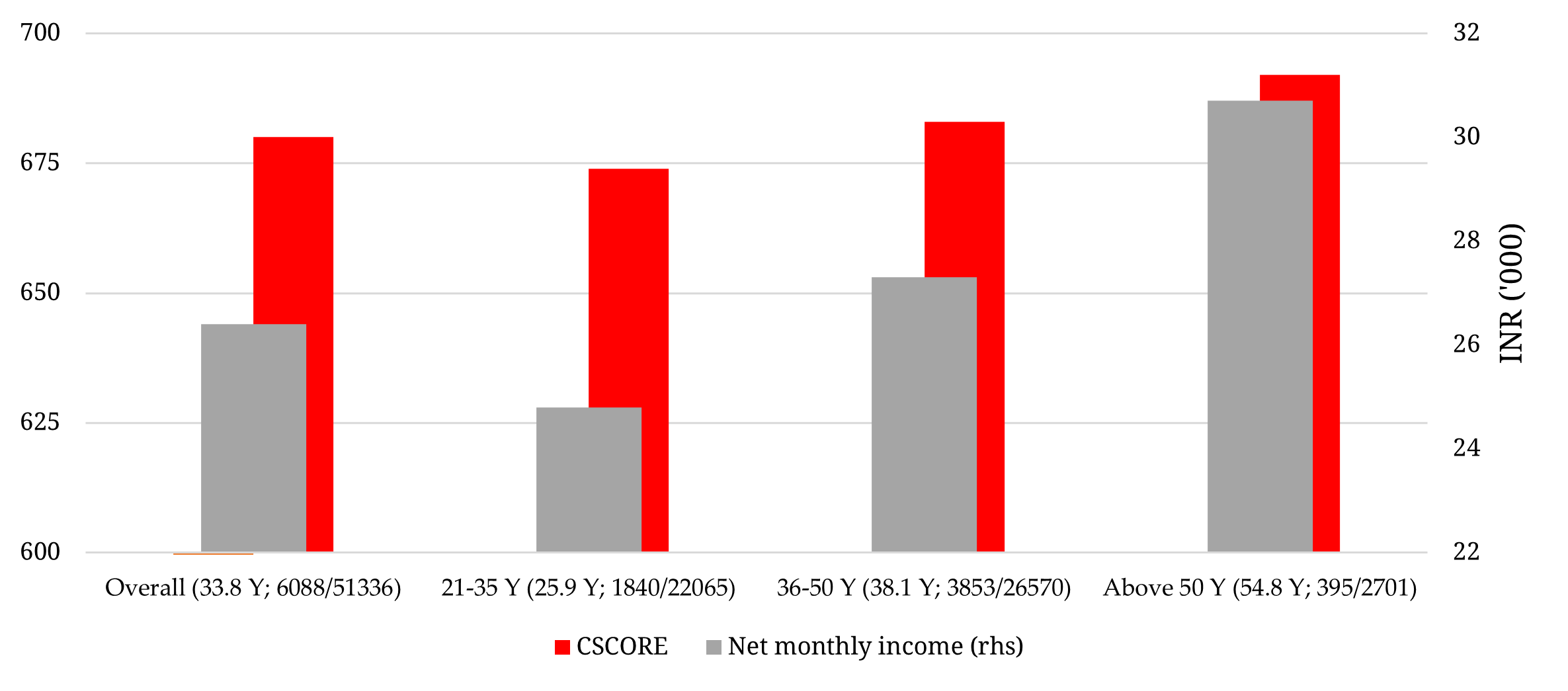 Figure 1 presents the averages of the key variables, overall and by age bucket. We consider three age buckets: low (21-35 years, Y), middle (36-50 years, Y), and high (above 50 years, Y), reflecting the life-cycle hypothesis. The subsequent analysis also takes this into account. The brackets under each column provide the average age, the total number of females, and the total number of applicants in that category. Thus, the average applicant age for the overall sample is 33.8 years, and there are 6088 females, with the majority (3,853, or 63%) falling within the middle-aged category. The average credit score is 680, and it increases as one graduates into higher age buckets. The right-hand scale (rhs) plots the average income. Here again, it is the highest in the above-50-year bucket and the lowest in the 21-35-year bucket.